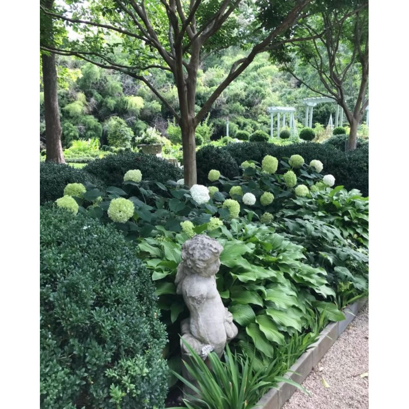 Na ovoj slici možete videti sledeće biljke : hosta, šimšir, pahisandra, ukrasna trava Irish Green, hortenzija Anabell, ukrasno drveće, zimzelene biljke
