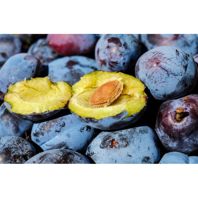 Rodi rano, redovno i obilno. Plod je krupan, prosečno 30-45gr, prečnika 35-40mm. Kora je tamnoplave boje, jako pepeljaste boje. Meso je na početku zrenja tvrdo, dobre konzistencije, zelenkasto-žuto-zlatno-žute boje, bez koštica, srednjeg ukusa. Poslednji dani jula-početak avgusta, mesec dana pre Stenlija.